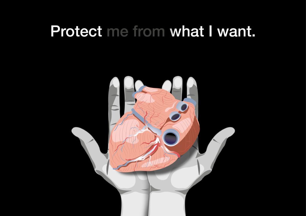 Das Herz als Symbol steht für Liebe, Gefühle, aber auch für das Leben. Bei dieser Illustration ist eine Person zu erkennen, die ihr „Leben“ auf Händen trägt. Der Ursprüngliche Schriftzug wird auf zwei Arten interpretiert: einerseits mit „Protect me from what I want“ und andererseits mit „Protect what I want“. Bezogen auf die Illustration heißt das: „Schütze mich vor dem Leben“ und „Schütze das Leben selbst“.