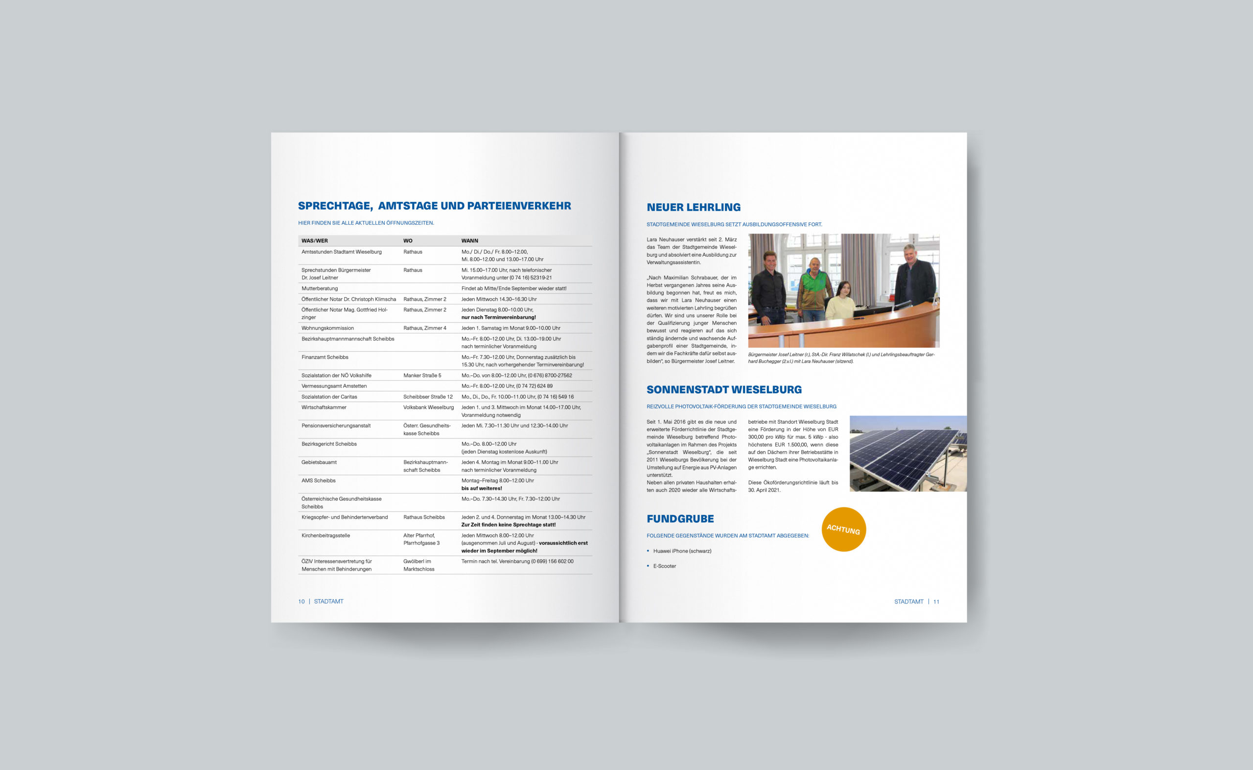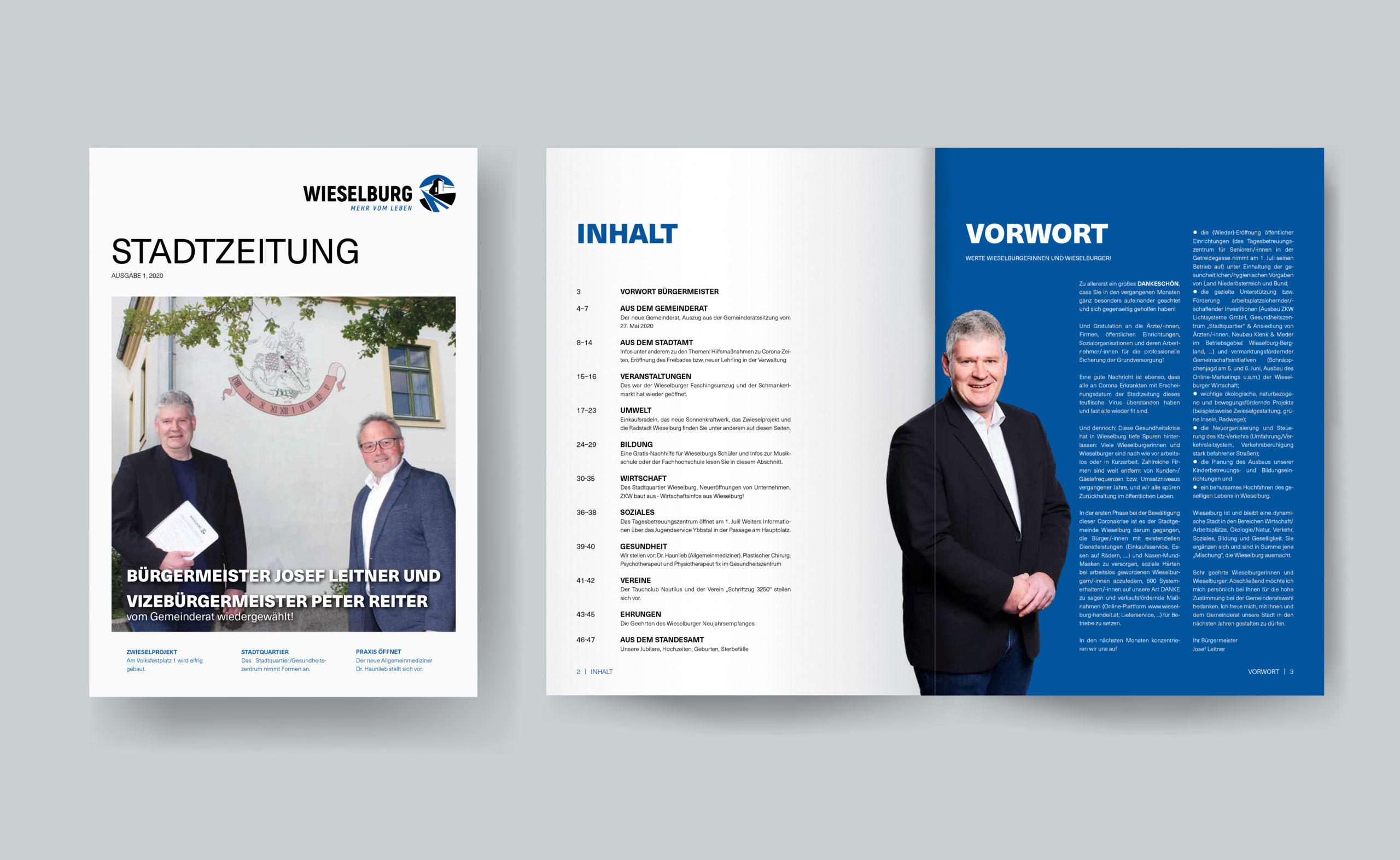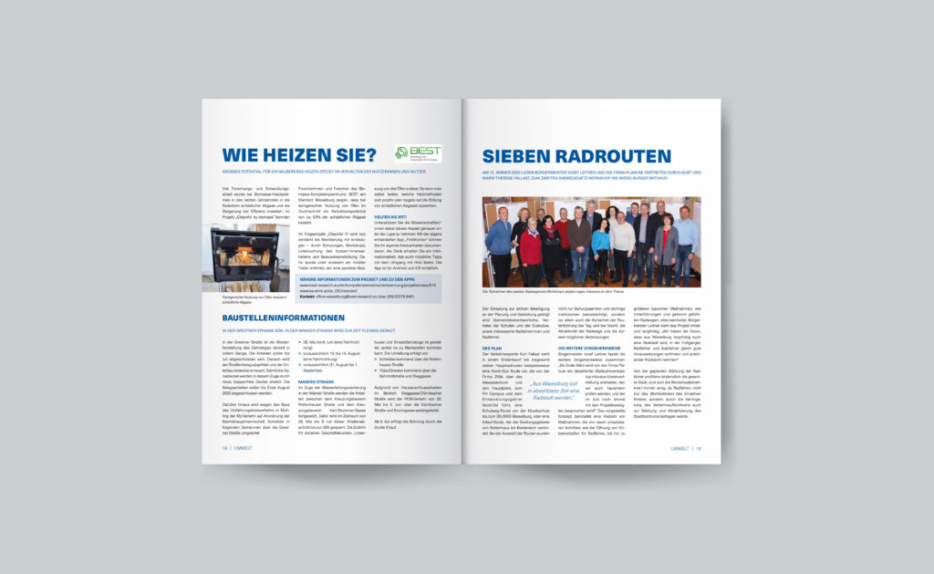 Als Praktikantin bei der Stadtgemeinde Wieselburg durfte ich bei der Neugestaltung der Gemeindenachrichten mitwirken und war an der Konzeption und Umsetzung des Layouts beteiligt. Die Farbgebung der Zeitschrift wurde an das neue Logo der Gemeinde angepasst. Der Satzspiegel verleiht dem Layout genügend Weißraum, wodurch der Inhalt der Zeitung in den Vordergrund rückt. Die serifenlose Schrift Neue Haas Unica wurde für Headlines und Fließtext verwendet. Orange Buttons heben sich von der Kontrastfarbe Blau ab und weisen auf wichtige Informationen hin. LeserInnen werden über Termine und Veranstaltungen in übersichtlichen Tabellen informiert. (Mockup Broschüre designed by rawpixel.com, www.freepik.com)